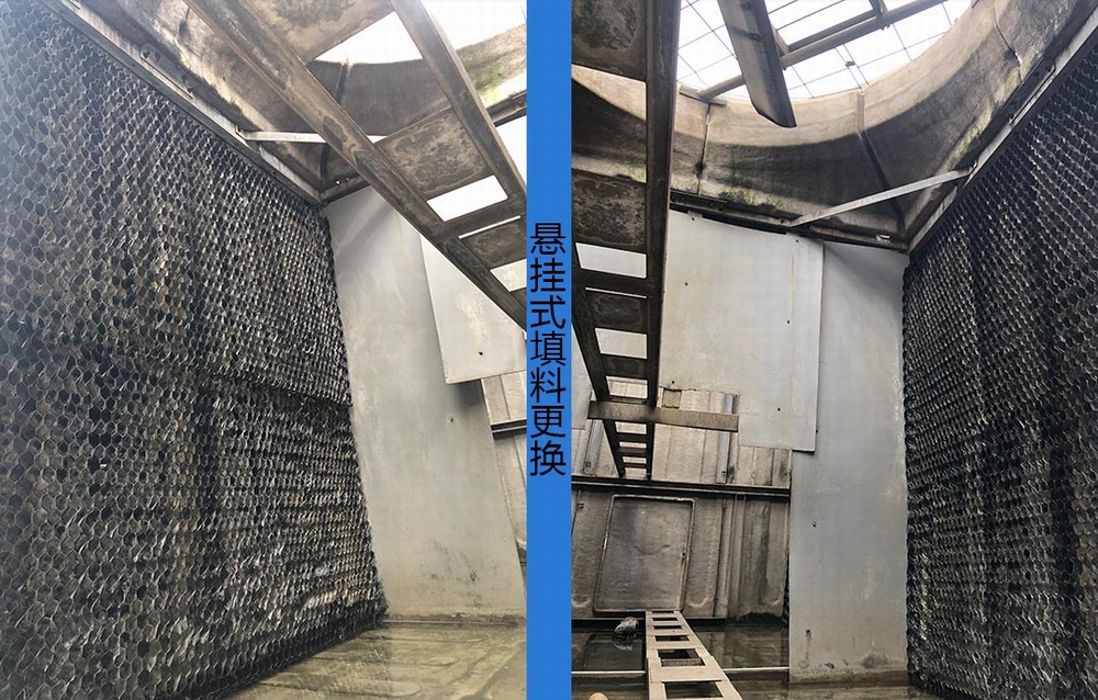 冷却塔填料孔的阻塞主要是由于砂土、尘土的落入,藻类的构成、生长和水垢等构成的.假设发现填料中呈现这种有害的倾向,应及早进行必要的处置,以避免填料孔穴阻塞,由于填料老 化、破碎而构成布水不均匀,常常性地查看填料胜污、结垢、藻类生长及破损的情况。要做到早发现早处置早替换。