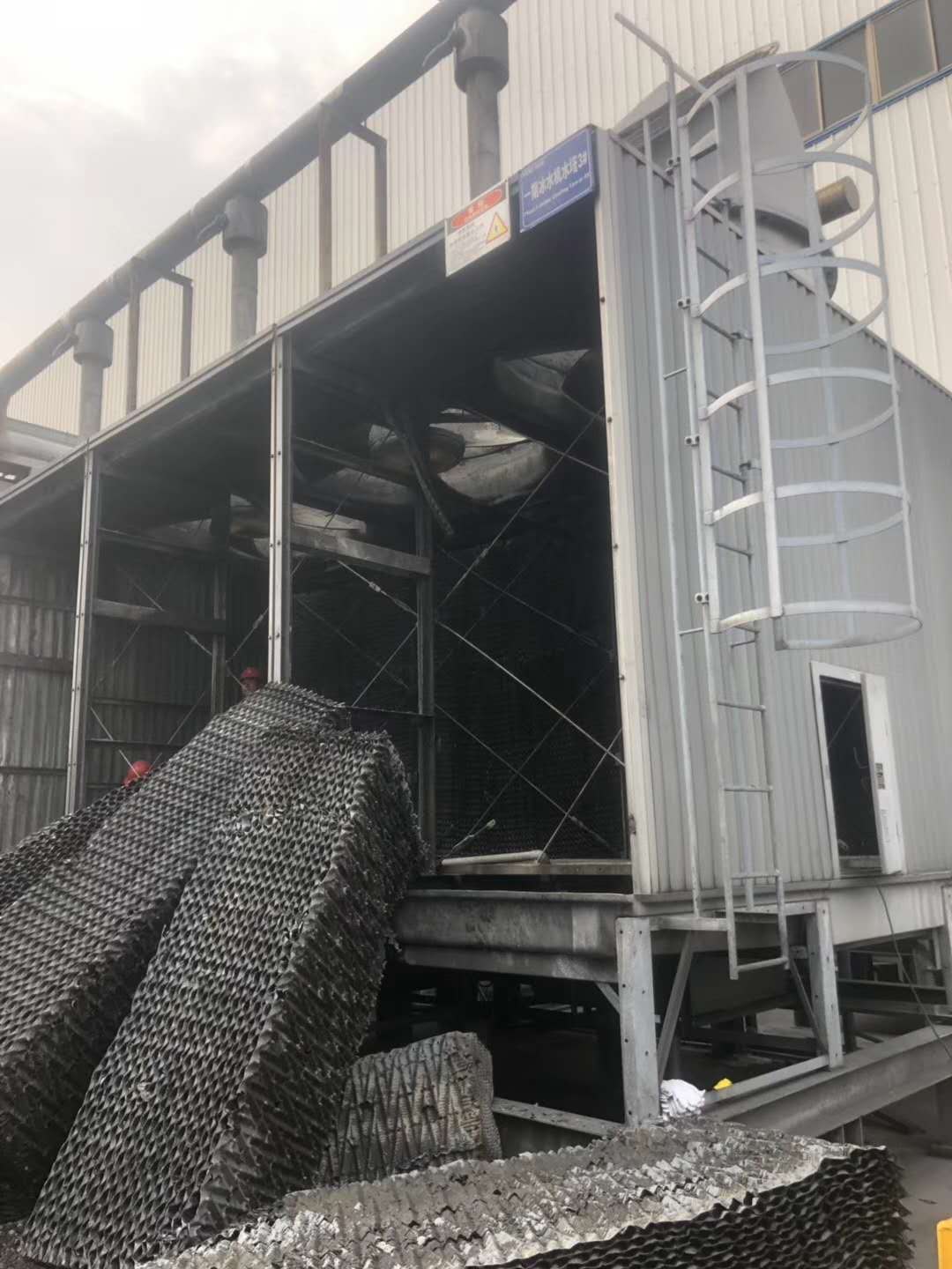 冷却塔填料更换步骤如下:1、先拆除需要更换填料的冷却塔百叶2、再拆除出来的冷却塔填料3、冷却塔填料全部拆除完成,清洗冷却塔集水盘4、旧冷却塔填料,堆放在指定地点,不能随意放置,等待用吊车吊下装走,送到专业垃圾处理点。5、新的冷却塔填料开始安装6、安装完成后采用专业垃圾处理车,废旧填料装车完成,运送到可处理垃圾回收点。